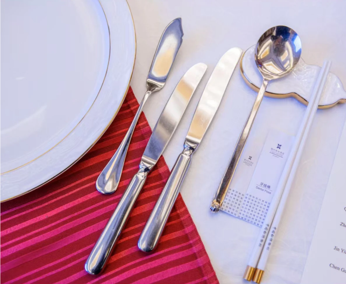 《四海一心》金砖元首餐具,不仅寓含着美好而深切的祝愿,还充分展现了中国传统与现代文化相互交融、共同升华的和谐之美,宛如一曲动人的餐桌交响乐,让世界领略到了中国元素的气度与中华文化的深厚底蕴。整套餐具在装饰上大胆创新,使用了吉祥纹饰“谷粒纹”。这种纹饰以剔地浮雕的技法雕琢出突起的弧形圆点,形似谷粒,寓意着风调雨顺、五谷丰登的共同愿望和丰收的喜悦,令人赏心悦目。谷粒纹饰与中国白瓷的精致器皿相结合,进一步提升了餐具的设计内涵和艺术观赏价值。