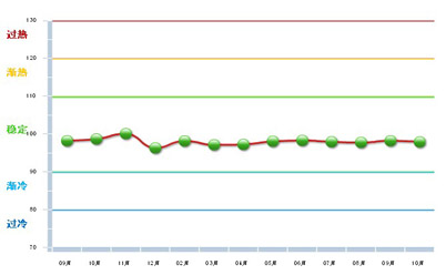2013年10月中轻五金行业景气指数继续保持在“稳定”区间内运行,基本保持着稳定态势(图2)。