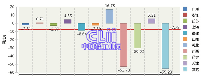 图7 2014年1~3月主要地区家具行业累计出口值增速情况