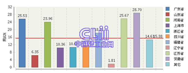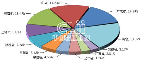 1~8月,家具行业累计利润额居全国前十位地区中出广东超过山东成为第一,其他8个地区的排名与1~7月相同。其中,广东的累计利润总额(下同)占14.94%,山东占14.33%,河南占13.47%,上海占8.83%,浙江占7.78%,四川占5.48%,福建占4.55%,辽宁占4.26%,江苏占3.31%,安徽占3.17%(图6)。