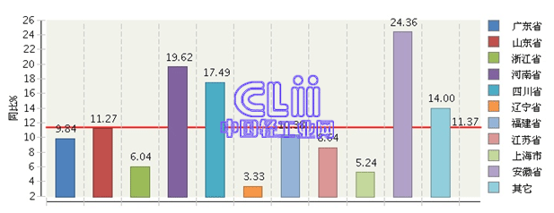 图7 2014年1~11月主要地区家具行业规模以上企业累计主营业务收入增速情况