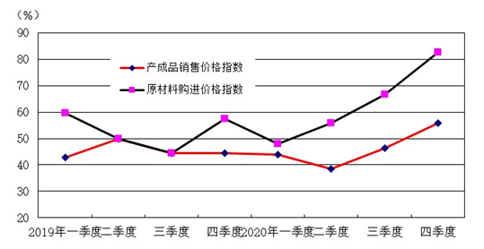 2020年四季度,产成品销售价格指数为55.8,终于上升到临界点50以上区间,表明产品销售价格呈增长趋势。指数环比三季度上行9.5个百分点,同比上年四季度上升11.3个百分点,表明2020年四季度产成品销售价格触底反弹。原材料购进价格指数为82.7,远高于临界点之上,指数环比三季度上升16.0个百分点,同比上年四季度上升25.3个百分点,表明2020年四季度原料购进价格大幅上涨,且增速持续扩大。