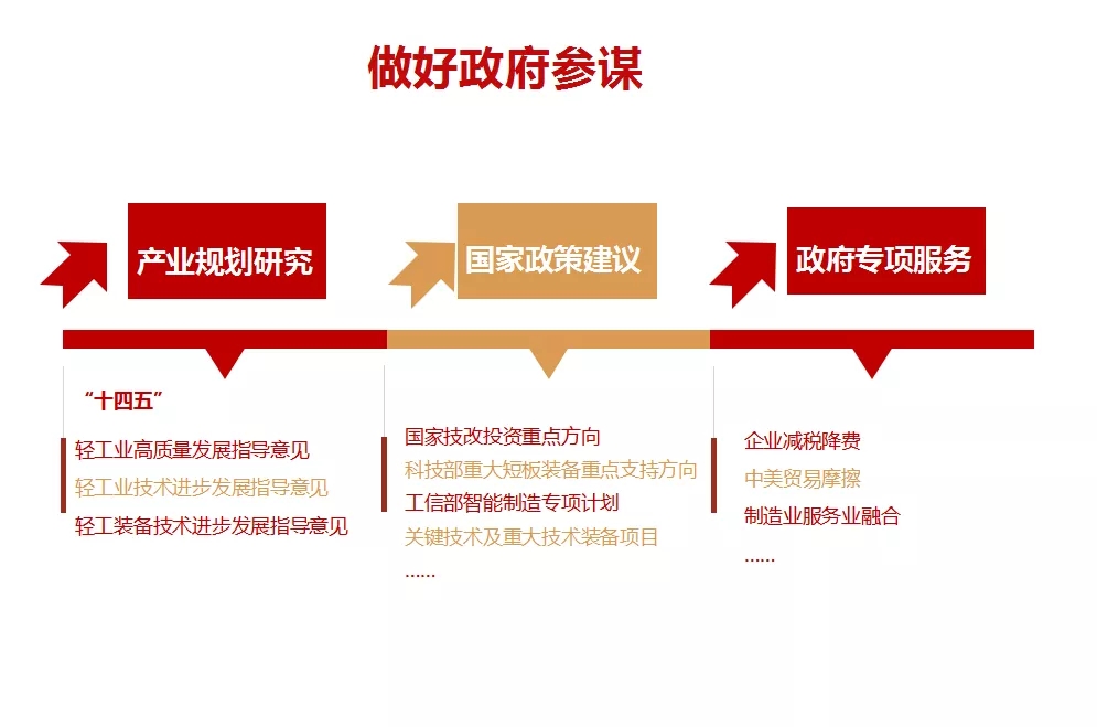一是参与产业规划综合研究。五年来,通过 等上级主管部门渠道,相继参与了轻工业“十四五”高质量发展指导意见、轻工业技术进步“十四五”发展指导意见、轻工装备技术进步“十四五”发展指导意见研究等,结合行业高质量发展需求提出多项建议。