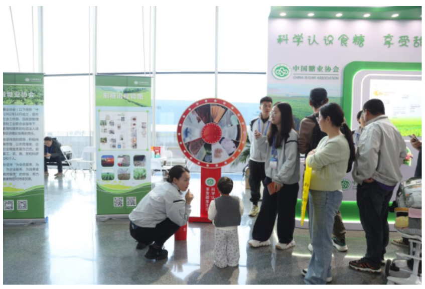 在“制糖工艺流程图”展示区,观众们通过直观的图示,深入了解甘蔗和甜菜转化为食糖的全过程。观众王女士表示:“这样的展示让书本上的知识变得生动直观,孩子也能更好地理解。”在“食糖真相抽签”区域,观众们通过抽取问题签并对照展板上的“关于糖的十个真相”寻找答案,深入了解食糖的科学知识。“食糖品类大转盘”互动环节中,参与者通过转动彩色转盘,随机回答有关甘蔗糖、红糖、冰糖等品类知识。
