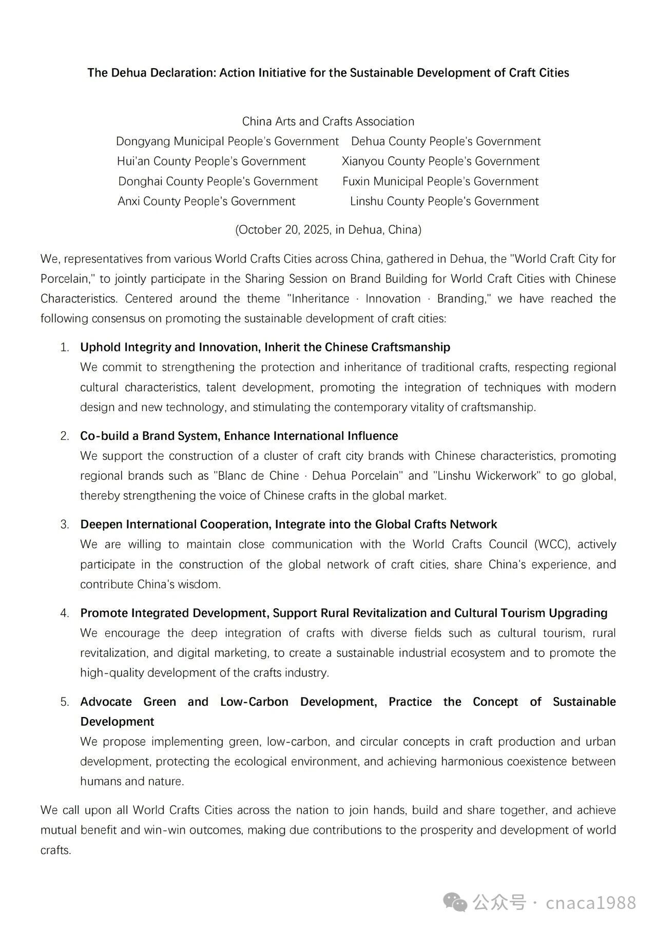德化宣言:手工艺城市可持续发展行动倡议