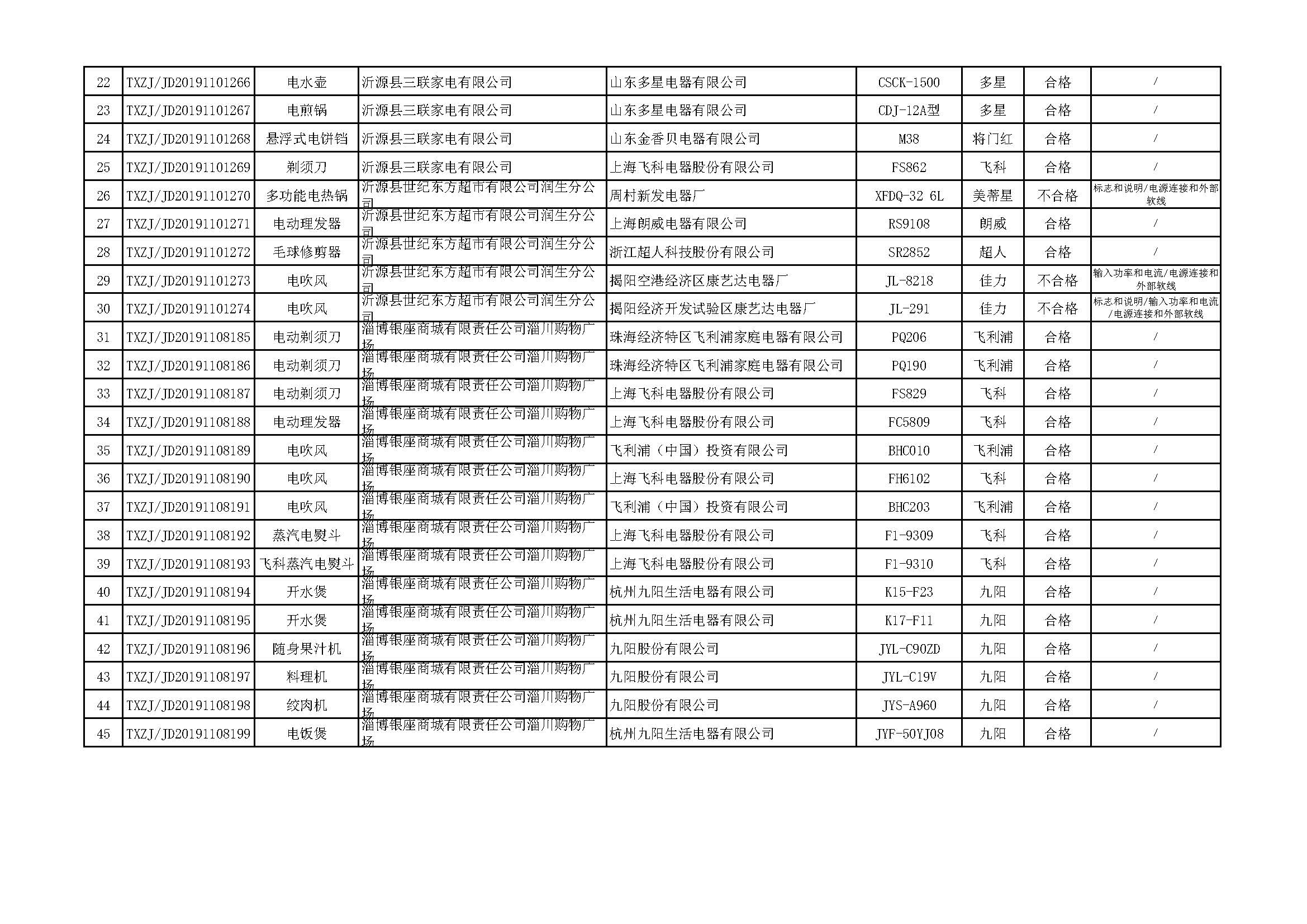2020年1月17日,淄博市市场监督管理局官网发布2019年流通领域小家电类商品抽检信息。2019年10月,根据省局《山东省市场监督管理局关于开展2019年度省级流通领域商品质量集中抽查检验工作的通知》要求,对流通领域小家电类商品进行质量抽检,对7户经营单位的45组小家电商品进行了抽样检测,6组商品不合格,不合格项目涉及:标志和说明、输入功率和电流、电源连接和外部软线。