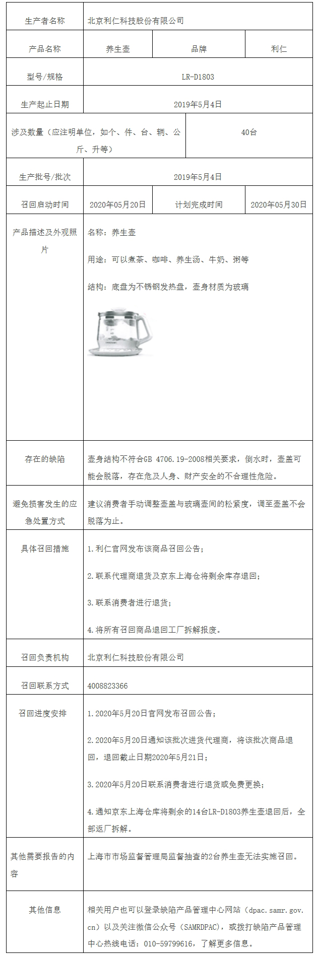 据北京市市场监督管理局网站2020年8月17日消息,日前,北京利仁科技股份有限公司按照《消费品召回管理暂行规定》的要求,向北京市市场监督管理局报告了召回计划,主动召回2019年5月4日制造的利仁牌养生壶(规格型号:LR-D1803),涉及数量为40台。