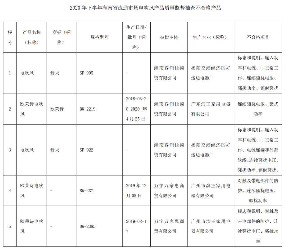 海南省市场监督管理局抽查18批次电吹风产品 不合格5批次
