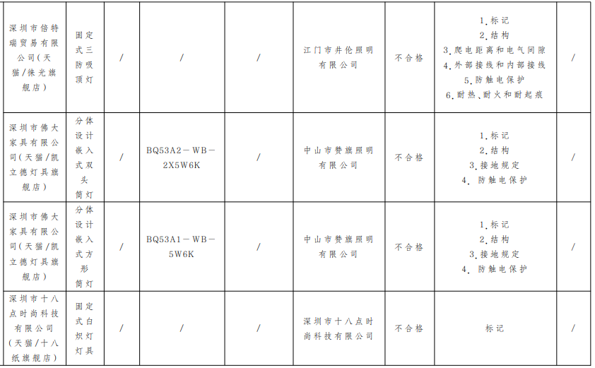 近日,深圳市市场监管局发布2021年个护健康器具等11类产品质量监督抽查结果。本次抽查了深圳市71家受检单位生产、销售的117批次灯及灯具产品,发现不合格产品28批次。其中,生产领域抽查了32家企业的54批次产品,发现不合格产品3批次;流通领域(实体店)抽查了12家企业的27批次产品,未发现不合格产品;流通领域(网络交易平台)抽查了27家企业的36批次产品,发现不合格产品25批次。