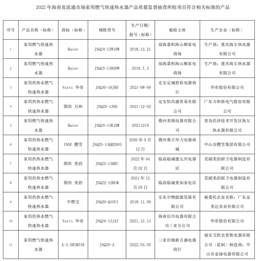 据海南省市场监督管理局网站2022年11月3日消息,近期,海南省市场监督管理局对全省流通市场家用燃气快速热水器产品进行了监督抽查。本次抽查了40批次产品,不合格2批次。