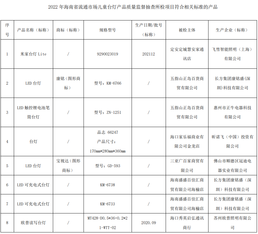 据海南省市场监督管理局网站2022年11月3日消息,近期,海南省市场监督管理局对全省流通市场儿童台灯产品进行了监督抽查。本次抽查了20批次产品,经检验,不合格7批次。