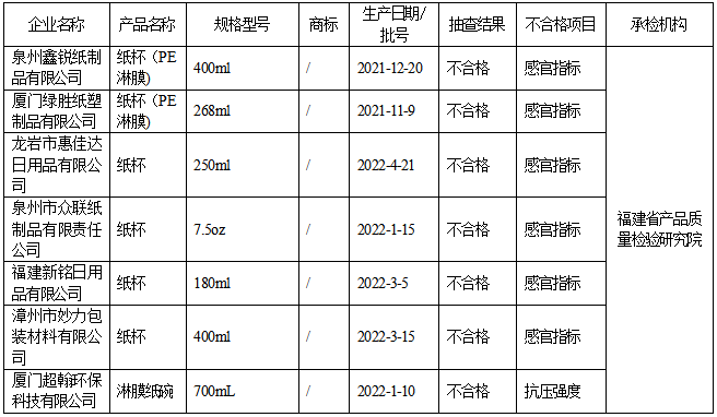 福建省食品接触用纸制品产品质量省级监督抽查结果(不合格)