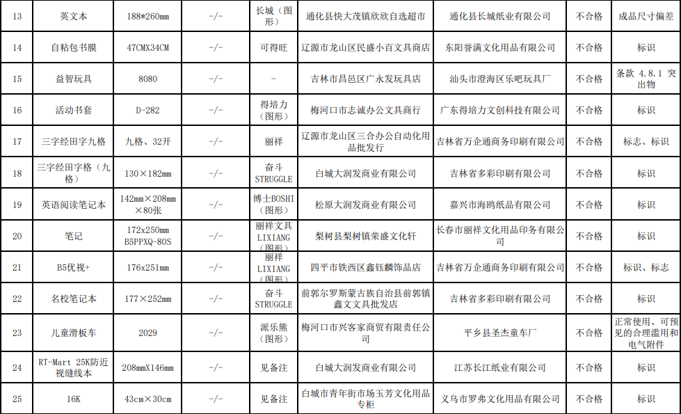 不合格产品标称生产单位涉及,吉林省万企通商务印刷有限公司、吉林省多彩印刷有限公司、辽宁省海城市佳信印刷厂、通化县长城纸业有限公司、汕头市澄海区乐吧玩具厂、广东得培力文创科技有限公司、长春市丽祥文化用品印务有限公司、江苏长江纸业有限公司、平乡县圣杰童车厂、上海小吉鸭文具有限公司台州分公司、安硕文教用品(上海)股份有限公司、上海妙德文具有限公司、佛山市智慧创意文具有限公司等。