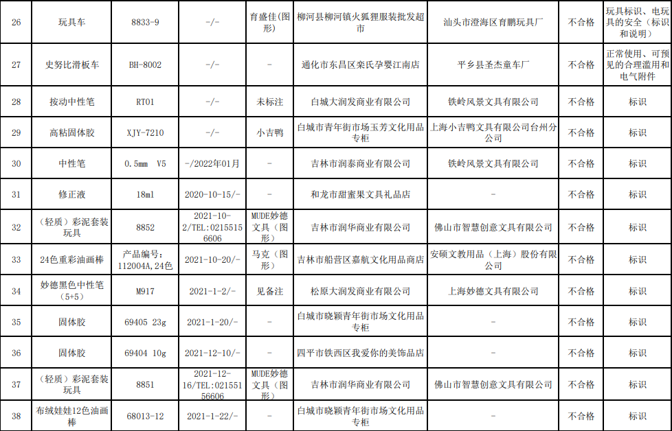 2022年吉林省儿童学生用品产品质量监督抽查不合格产品汇总表