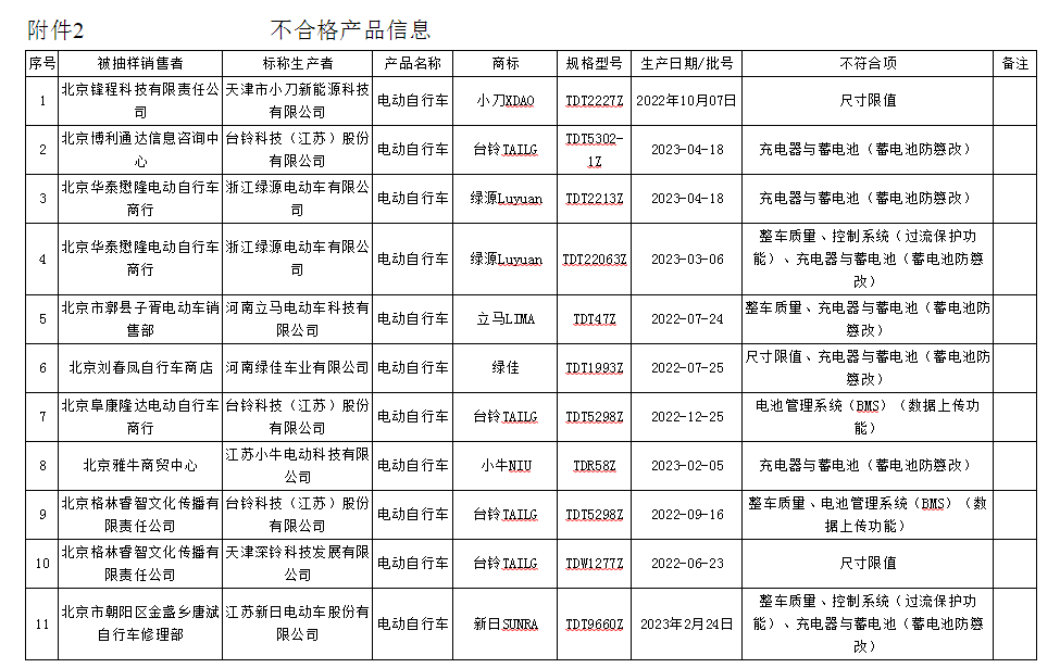 不合格产品涉及天津市小刀新能源科技有限公司、台铃科技(江苏)股份有限公司、河南立马电动车科技有限公司、河南绿佳车业有限公司、江苏小牛电动科技有限公司、江苏新日电动车股份有限公司等标称生产企业;商标涉及小刀XDAO、台铃TAILG、立马LIMA、小牛NIU、新日SUNRA等。不合格项目涉及尺寸限值、充电器与蓄电池(蓄电池防篡改)、整车质量、控制系统(过流保护功能)等。