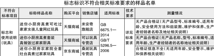 本次测试的儿童厨房“真煮”厨具中,天猫商城米安奇旗舰店、可以玩具专营、京东商城桑妮玩具专营店销售的3款样品不符合GB 6675.1—2014《玩具安全 第1部分:基本规范》和GB/T 5296.5—2006《消费品使用说明第5部分:玩具》中关于玩具标志标志的相关标准要求,部分样品纯粹由销售方拼凑组合而成,玩具整体以及加热器以外的材料和部件均找不到厂家和标识信息。这种拼凑组合的玩具产品未明示各个部件的生产厂家或对整套产品质量负法律责任的生产厂家,产品存在较大的安全隐患。