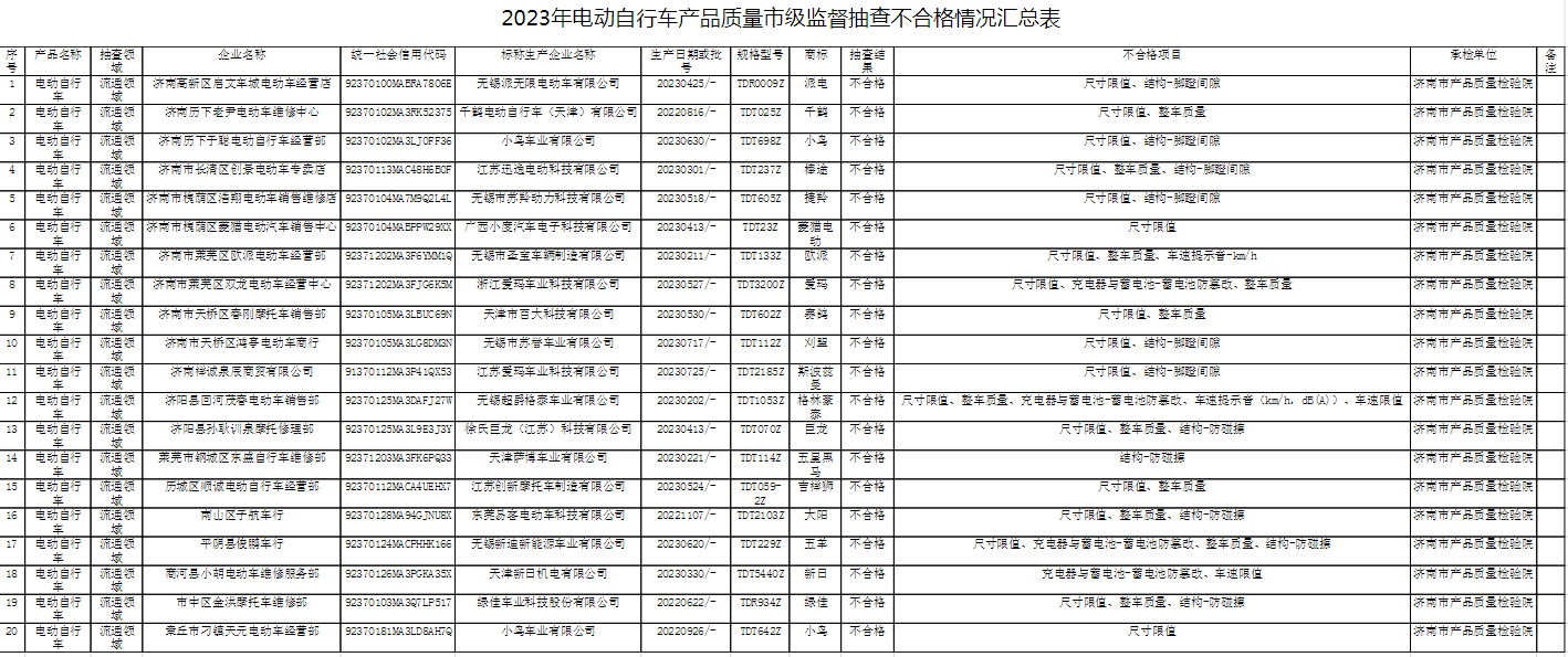 近日,济南市市场监督管理局公布2023年第一批电动自行车产品质量市级监督抽查结果。本次抽查发现20批次产品不符合相关标准的要求,大阳、五羊、新日、绿佳、小鸟等商标产品榜上有名。