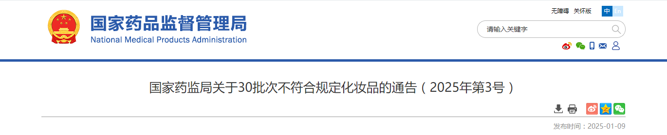 国家药监局关于30批次不符合规定化妆品的通告(2025年第3号)