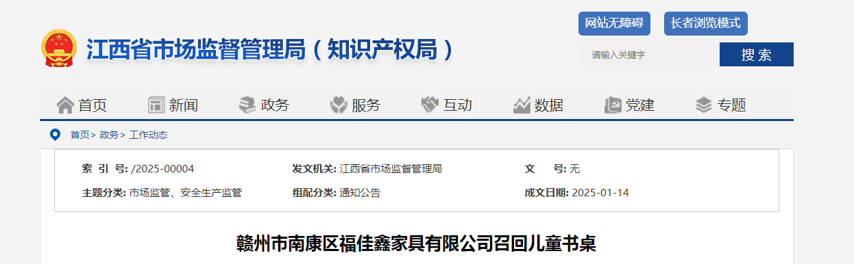 赣州市南康区福佳鑫家具有限公司召回儿童书桌