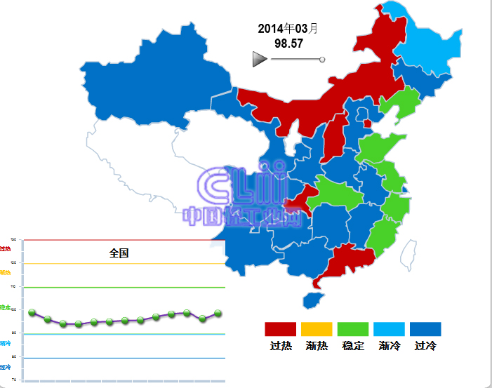 从分地区景气运行情况来看,3月份,内蒙古、天津、山西、重庆和广东5个地区处于“过热”区间,占全国地区总数(下同)的16.12%;辽宁、山东、安徽、浙江、福建和湖北6个地区处于 “稳定”区间,占全国的19.35%;黑龙江属于“渐冷”区间,处于“过冷”区间的有新疆、吉林、甘肃、云南、四川、陕西、贵州、广西、河北、河南、湖南、江西、安徽、上海、海南共15个地区,占全国的48.39%。(图1-3)。