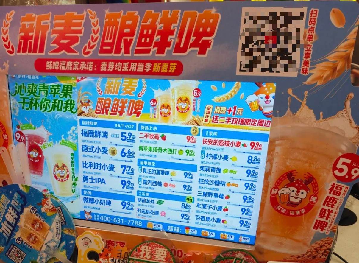 公开资料显示,鲜啤福鹿家成立于2021年,主打现打鲜啤产品,涵盖经典鲜啤、果啤、茶啤等多个品类,2024年实现扭亏为盈(除税后纯利107.09万元),截至2025年8月已在全国28省布局1200家加盟门店。