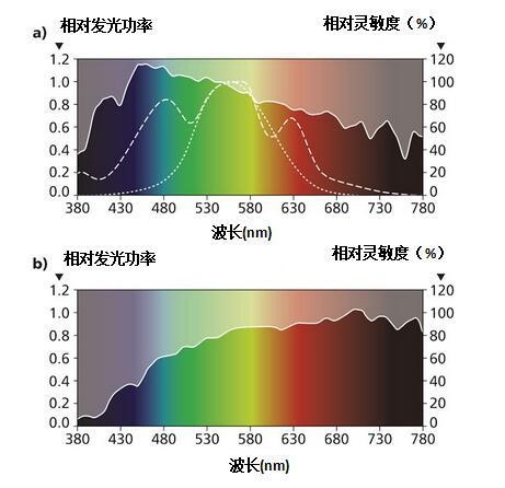 图2. 白炽灯光谱(a)与节能灯光谱(b)
