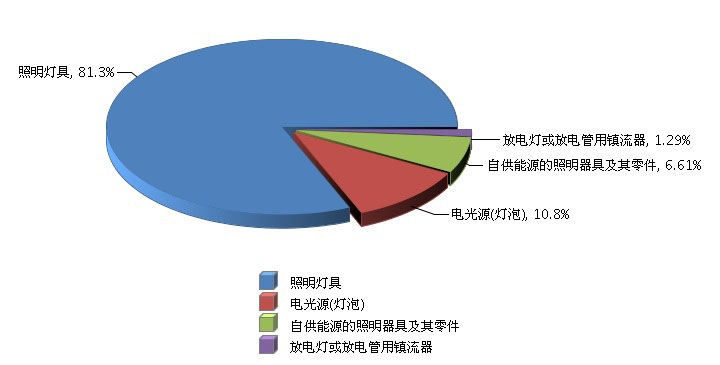 2014年1月~3月,全国照明行业完成累计出口额78.33亿美元,同比增长10.25%。其中,照明灯具累计出口额占72.37%,同比增长25.48%;电光源(灯泡)累计出口额占18.02%,同比增长-18.52%;自供能源的照明器具及其零件累计出口额占6.8%,同比增长-14.99%;放电灯或放电管用镇流器累计出口额占2.81%,同比增长-3.63%。