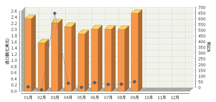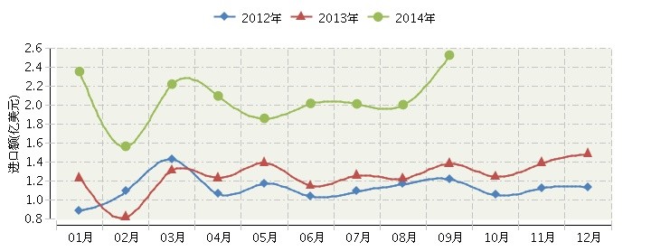 根据海关总署发布数据,2014年1月~9月,全国化妆品行业累计完成进口额18.65亿美元,同比增长69.59%。其中:1月份完成进口额2.35亿美元,同比增长39.07%;2月份完成进口额1.57亿美元,同比增长13.05%;3月份完成进口额2.22亿美元,同比增长681.27%;4月份完成进口额2.1亿美元,同比增长70.07%;5月份完成进口额1.86亿美元,同比增长34.14%;6月份完成进口额2.02亿美元,同比增长74.99%;7月份完成进口额2.01亿美元,同比增长60.02%;8月份完成进口额2亿美元,同比增长63.4%;9月份完成进口额2.53亿美元,同比增长82.63%。
