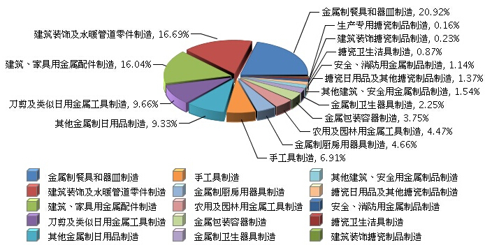 从各子行业上分析,2015年1月~2月,由金属制餐具和器皿制造、建筑装饰及水暖管道零件制造、建筑、家具用金属配件制造三个行业累计完成的出口交货值占比较高,合计超过50%以上。各子行业中建筑装饰搪瓷制品制造、生产专用搪瓷制品制造两个行业增速最快,均超过20%。;刀剪及类似日用金属工具制造、金属包装容器制造、金属制卫生器具制造、搪瓷卫生洁具制造几个行业出现了不同程度的负增长。