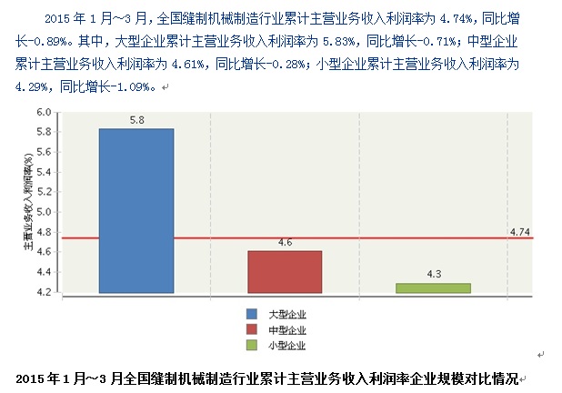 2015年3月全国缝制机械制造行业累计主营业务收入利润率4.74%