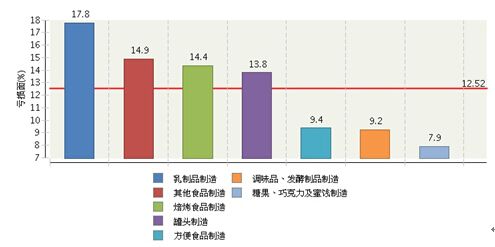 其中,乳制品制造累计亏损面为17.78%,同比增长1.27%;其他食品制造累计亏损面14.9%,同比增长2.24%;焙烤食品制造累计亏损面14.36%,同比增长0.82%;罐头制造累计亏损面13.81%,同比增长1.48%;方便食品制造累计亏损面9.39%,同比增长0.95%;调味品、发酵制品制造累计亏损面9.25%,同比增长0.81%;糖果、巧克力及蜜饯制造累计亏损面7.92%,同比增长0.5%。