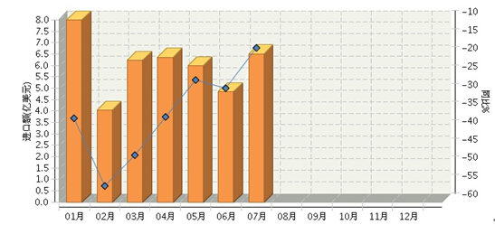 根据国家海关公布数据,20151月~7月,全国食品行业累计完成进口额41.97亿美元,同比增长-36.86%。其中:1月份完成进口额8亿美元,同比增长-37.05%2月份完成4.04亿美元,同比增长-55.57%3月份完成6.23亿美元,同比增长-47.16%4月份完成6.36亿美元,同比增长-36.62%5月份完成5.99亿美元,同比增长-26.5%6月份完成4.85亿美元,同比增长-28.72%7月份完成6.5亿美元,同比增长-17.65%2015年月度数据走势及同比增长情况如下图所示。