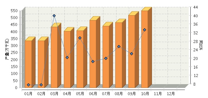 根据国家统计局公布数据,2015年1~10月,全国太阳能电池行业累计完成产量同比增长24.45%。其中:10月份完成产量同比增长35.05%。2015年全国太阳能电池行业月度产量及同比如下图所示。