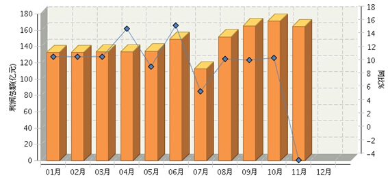 2015年1月~11月,全国食品行业累计完成利润总额1,579.54亿元,同比增长9.86%。从年初开始,除7月份利润较低外,行业利润逐月环比上升, 但11月份利润同比下降3.9%。