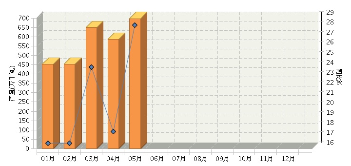 根据国家统计局公布数据,2016年1~5月,全国太阳能电池行业累计完成产量同比增长27.13%。5月份完成产量同比增长28.33%。2016年全国太阳能电池行业月度产量及同比如下图所示。