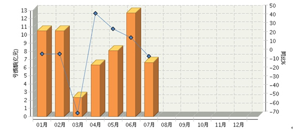 根据国家统计局公布数据,2016年1~7月,全国食品行业累计亏损额同比增长2.46%。其中:1月份亏损额同比增长0.74%;2月份亏损额同比增长0.74%;3月份亏损额同比增长-66.07%;4月份亏损额同比增长46.97%;5月份亏损额同比增长29.24%;6月份亏损额同比增长19.27%;7月份亏损额同比增长-1.75%。月度数据走势及同比增长情况如下图所示。