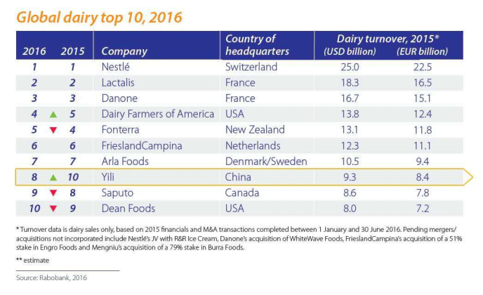 7月25日,荷兰合作银行发布2016年度“全球乳业20强”榜单。除了超过百年历史的国际巨头雀巢、达能、拉克塔利斯、恒天然、爱氏晨曦等企业外,作为亚洲唯一一家挺进10强的乳企——伊利,排名上升2位,跃居全球乳业8强,成为有史以来排名最高的亚洲乳企,打破了全球乳企前8强西方“独霸”的历史格局。