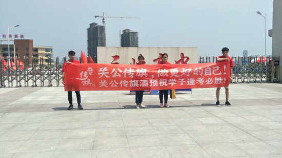 6月7日下午14:00,烈日炎炎,8名金网车队驾驶员与32名兼职大学生分赴夷陵中学、宜昌一中、葛洲坝六中等8个考点,搭建遮阳棚,为等候在考场外的考生家长们派发扇子、抽纸等消暑防晒物品。同时,在考点周边悬挂“关公传旗,做更好的自己!关公传旗酒预祝学子逢考必胜”等横幅,为考生加油鼓劲。6月8日下午高考结束后,坚守在考点周围的关公坊人第一时间向走出考场的学子们送上拥抱和鼓励,并热情邀请考生和家长假期到龙泉铺古镇和关公坊厂区游玩,体验关公坊品牌文化和白酒生产工艺。