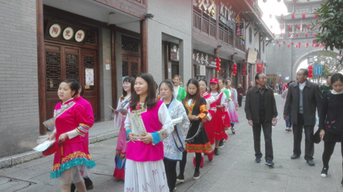 踏入古镇,随处可见稻花香志愿者的身影。她们是活动的服务者,是美的传递者,是稻花香形象的展现者,如同一道道绚丽的彩虹,与古街、古铺、菊花共同构筑成一道亮丽的风景线。