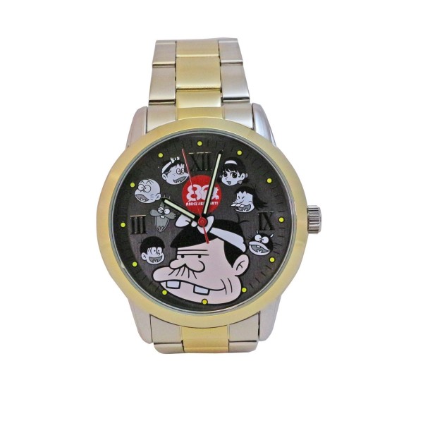 据悉,除了表盘上的针全部按逆时针转动外,这款手表的时刻也全部按相反顺序标记。表盘设计则特意以赤塚创作的畅销漫画《天才傻鹏》中的人物以及其本人的卡通形象为主题。