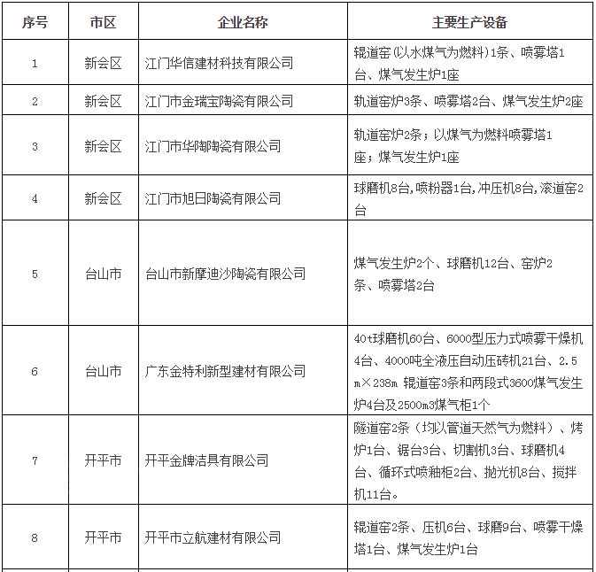 日前,江门市人民政府办公室在政府官网发布《江门市重点行业环境综合整治工作方案》。据江门市陶瓷生产企业清单显示,江门市现有陶瓷生产企业35家,其中新会区4家,恩平市20家,台山市2家,开平市8家,鹤山市1家。整治措施中指出,恩平市沙湖陶瓷集聚区陶瓷生产线总体规模须控制在59条以内,横陂陶瓷集聚区陶瓷生产线总体规模须控制在18条以内,严禁审批(备案或核准)超出环境容量的陶瓷生产线。