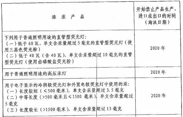 环境保护部环境保护对外合作中心副主任余立风在新闻发布会上公布了中国的履约时间表:从2021年起,中国将淘汰《关于汞的水俣公约》要求的含汞电池、荧光灯产品的生产和使用;VCM(氯乙烯,会产生含汞废水)生产行业实现单位产品的使用量在2021年降低50%(2010年的基础上);到2032年,要关停所有原生汞矿的开采;针对燃煤电场的排放源,到2020年完成排放编制,明确重点管控来源,确定减排目标和措施。