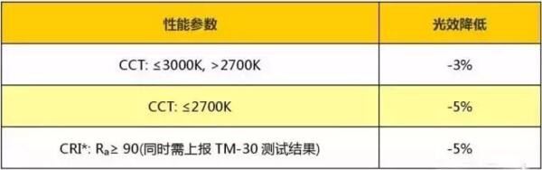 该政策降低高显指、低色温产品的光效要求。需要满足的条件和光效的调整如下表: