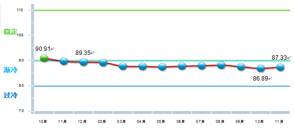 中国轻工业经济运行及预测预警系统数据显示,2015年11月中轻景气指数为87.33。近三年中轻景气指数呈现阶梯式下落走势,该指数自去年11月首次跌入渐冷区间以来,已连续12个月在蓝色渐冷区间运行,本月小幅上升0.44点,反映轻工运行情况有所回暖。