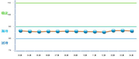 食品行业景气指数本年较去年回升,前4月均在渐冷区间顶部平稳运行。4月,行业景气度景气指数88.98,较上月微升0.12点。
