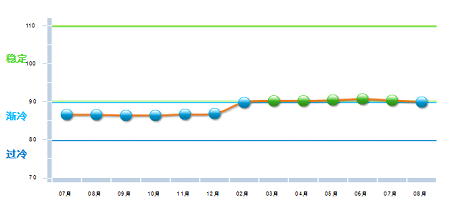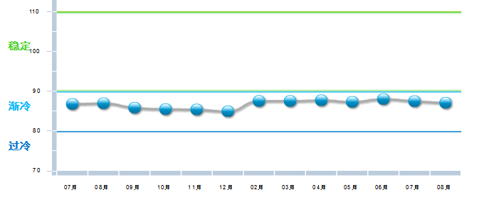 20178月, 对全国 25个行业进行监测,制糖行业景气度波动较大,由去年末过冷区间跃升到过热区间;缝纫机、造纸、眼镜、自行车、钟表、家电、乐器、乳品、玩具、日化、照明、家具、酿酒、电池、工美、五金、陶瓷、珠宝等18个行业在“稳定”区间,占比72%;塑料、皮革、玻璃、制盐、饮料、制笔等6个行业处于“趋冷”区间,占比24%。整体行业景气情况如下:
