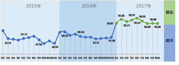 中国轻工业经济运行及预测预警系统数据显示:2017年以来,中轻景气指数自今年年初重回绿色“稳定”区间,并持续在稳定区间震荡运行,说明今年以来,轻工业经济运行有企稳回暖态势。10月,中轻景气指数为90.38,较上月小幅回落0.02点,该指数在本年6月上升至年度最高点后,连续小幅下降,8-10月连续三月在稳定区间边缘波动。