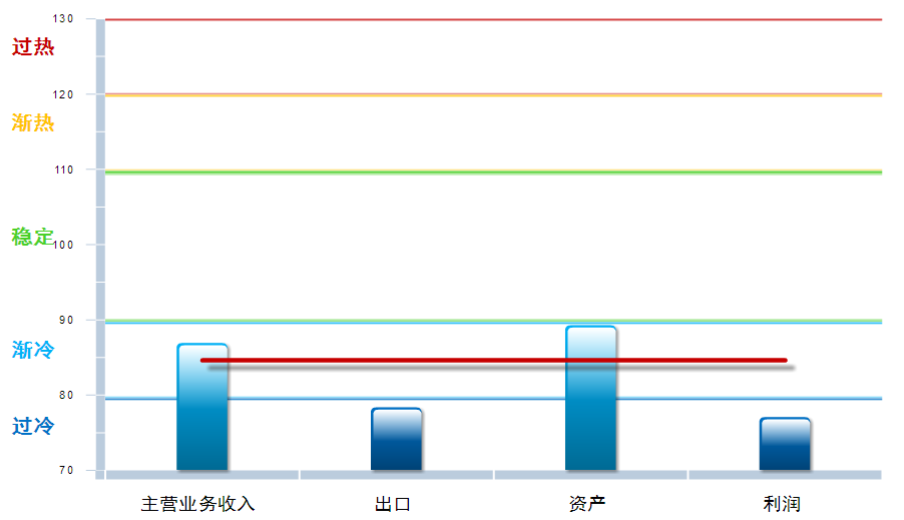 从分项指数看,主营业务收入景气指数86.93,位于“渐冷”区间,较上月下降1.83点;出口景气指数为78.37,位于“过冷”区间,较上月大幅下降15.01点;资产景气指数为89.30,位于“渐冷”区间,较上月回升0.88点;利润景气指数77.08,位于“过冷”区间,较上月下降1.21点。