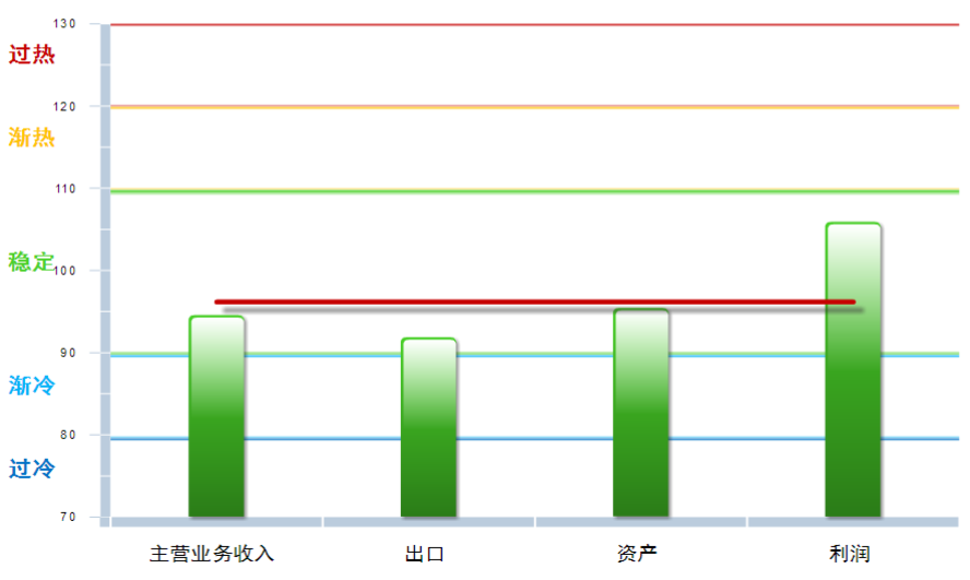 从分项指数看,主营业务收入景气指数94.59,位于“稳定”区间,较上月下降0.65点;出口景气指数为91.89,位于“稳定”区间,较上月下降5.94点;资产景气指数为95.43,位于“稳定”区间,较上月上升0.6点;利润景气指数105.91,位于“稳定”区间,较上月上升2.97点。