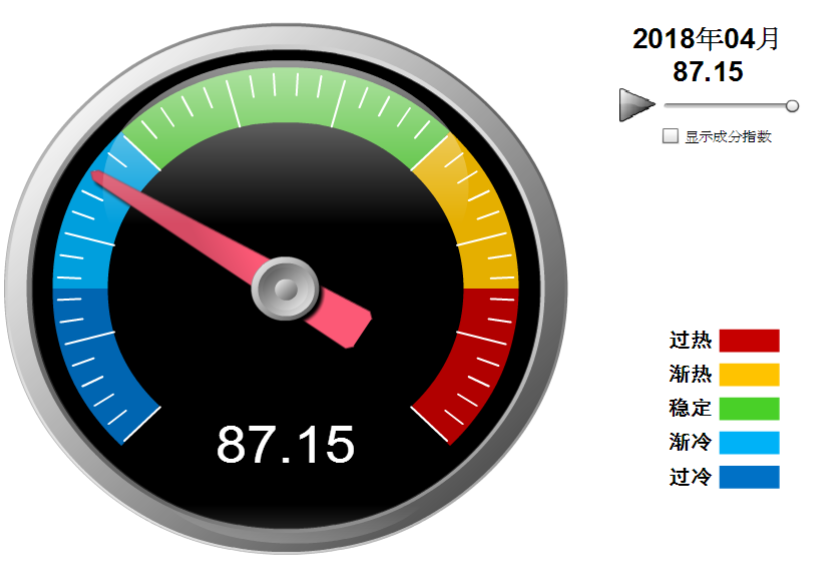 据中国轻工业经济运行及预测预警系统数据显示,2018年4月中国皮革制品制造业景气指数为87.15,处在浅蓝色“渐冷”区间,较3月下降0.14点。